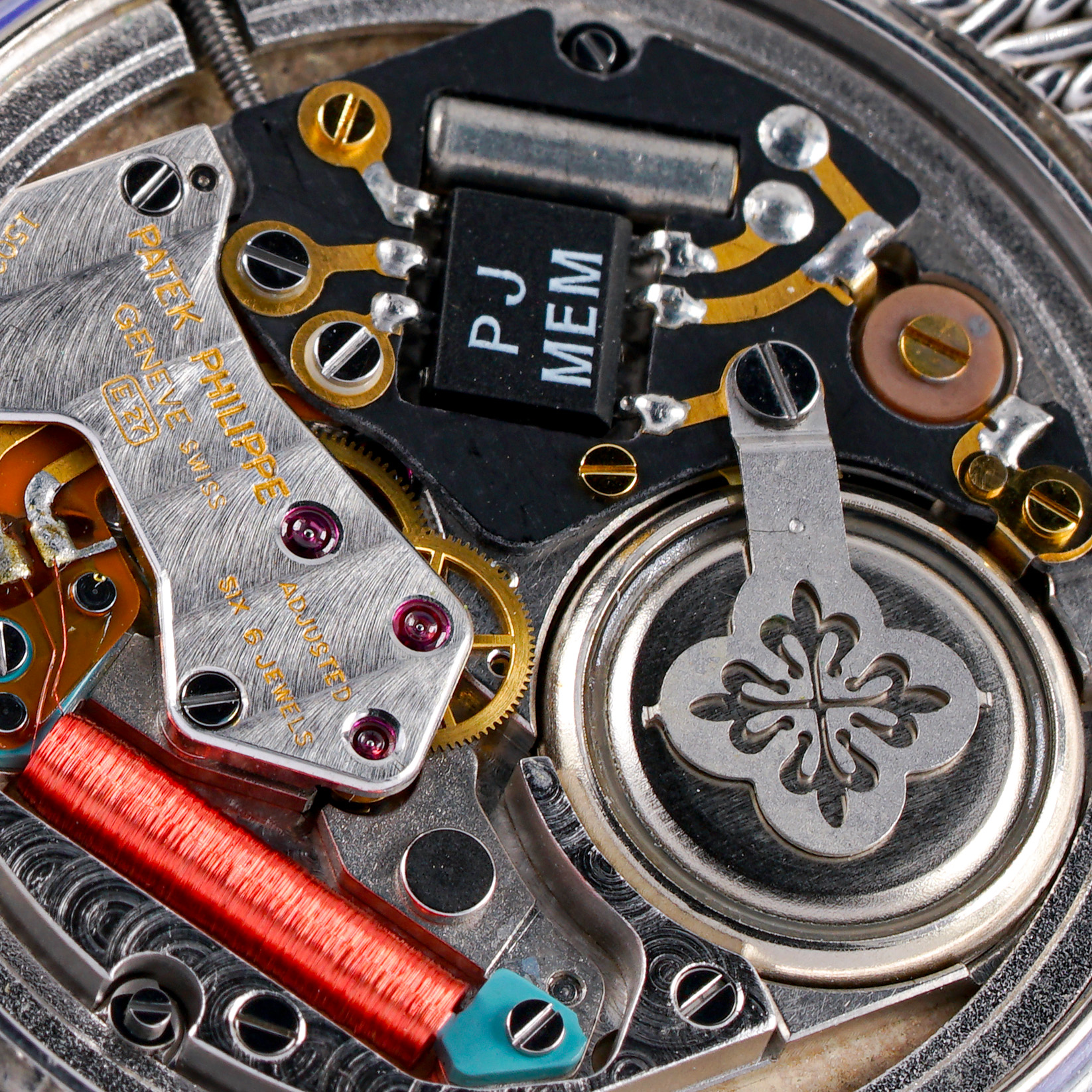 It is powered by the Patek Philippe E27 quartz calibre, one of the first movements developed by the manufacture after the Beta 21 and the E15 calibre.
