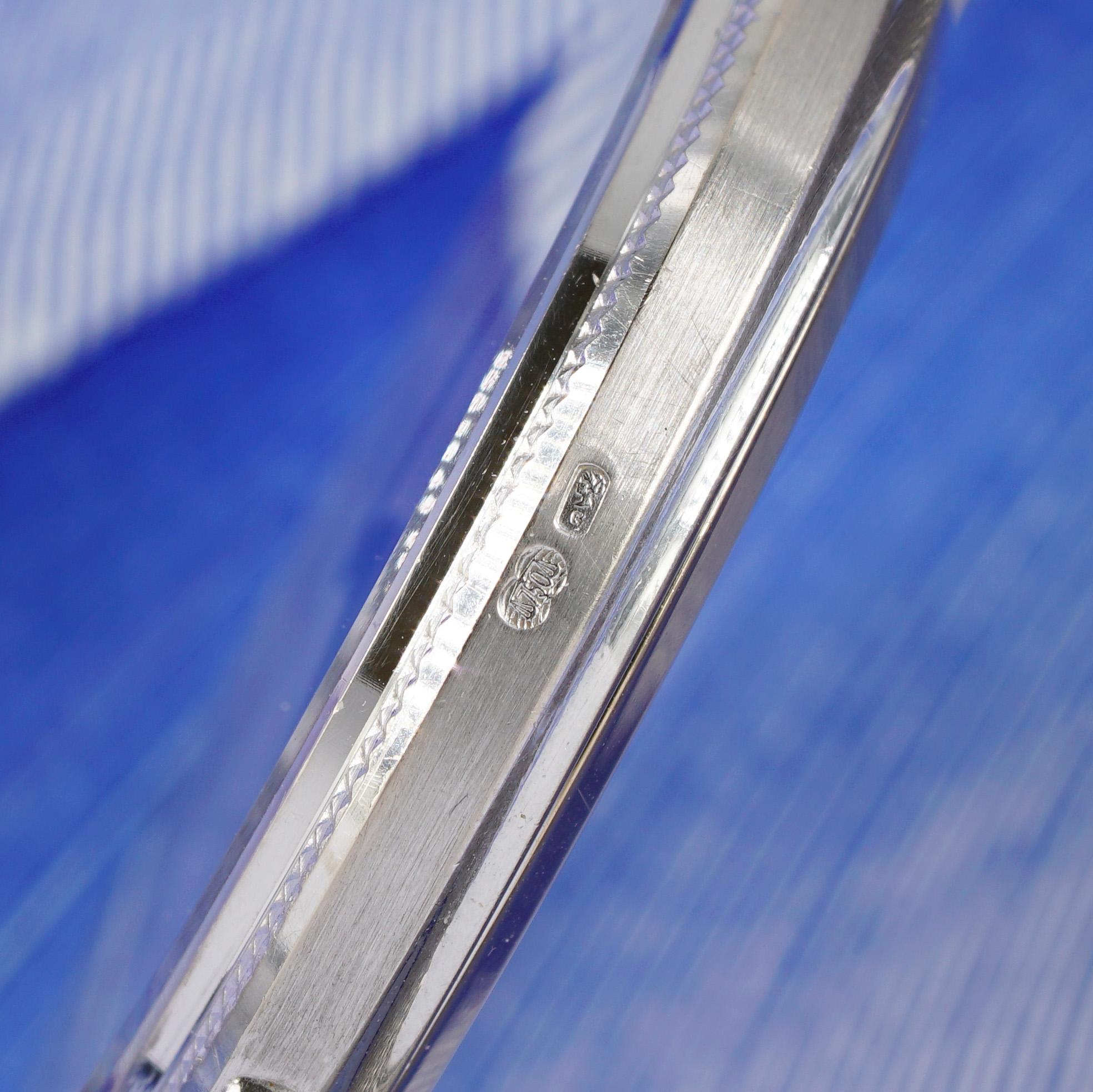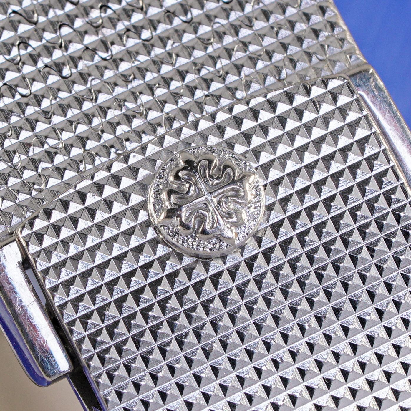 Its ultra-thin 33 mm case in 18-carat white gold is entirely decorated with the ‘Clous de Paris’ pattern, which appears on the bezel, integrated bracelet and clasp. The dial with Roman numerals, in imitation enamel, has cracks.